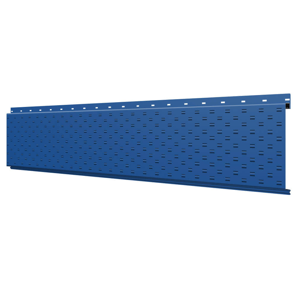 Линеарная потолочно-стеновая панель с ПЕРФОРАЦИЕЙ для вентиляции цвет RAL5005 Синий Сигнал применяется в качестве софитов для подшивы крыши, наружной и внутренней отделки потолков, стен, фронтонов фасада дома в Тамбове.