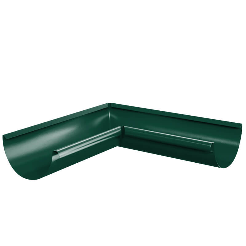 Угол желоба водостока внутренний 90 градусов d125мм RAL 6005 Зеленый металлический - используется для надежного сопряжения двух желобов между собой на внутренних углах 90 градусов карниза кровли. Угол желоба изготовлен без сварных сопряжений, методом прессования (глубокая вытяжка), что придает ему дополнительную коррозийную и механическую стойкость.